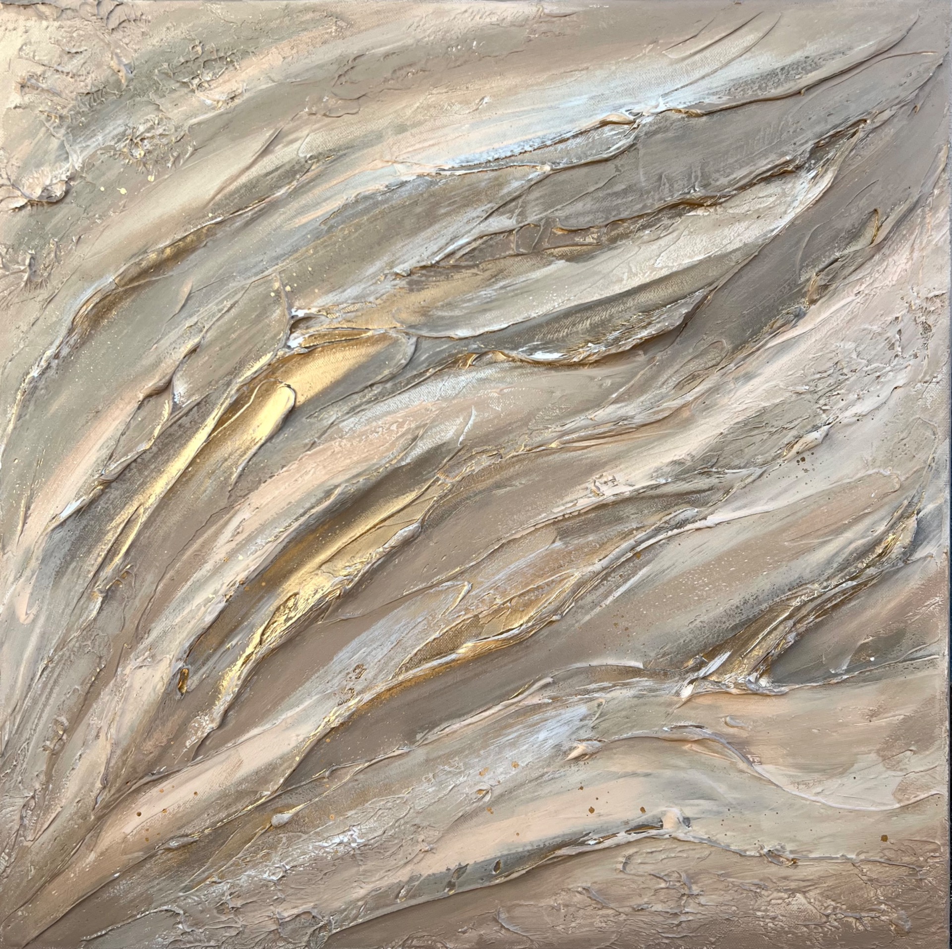 Obraz "FLOW" (neboli Plynutí) zachycuje lehkost a přirozený rytmus života. Béžové a bílé tóny se prolínají se zlatem jako jemné vlny, které symbolizují důvěru, klid a schopnost nechat věci plynout tak, jak mají.