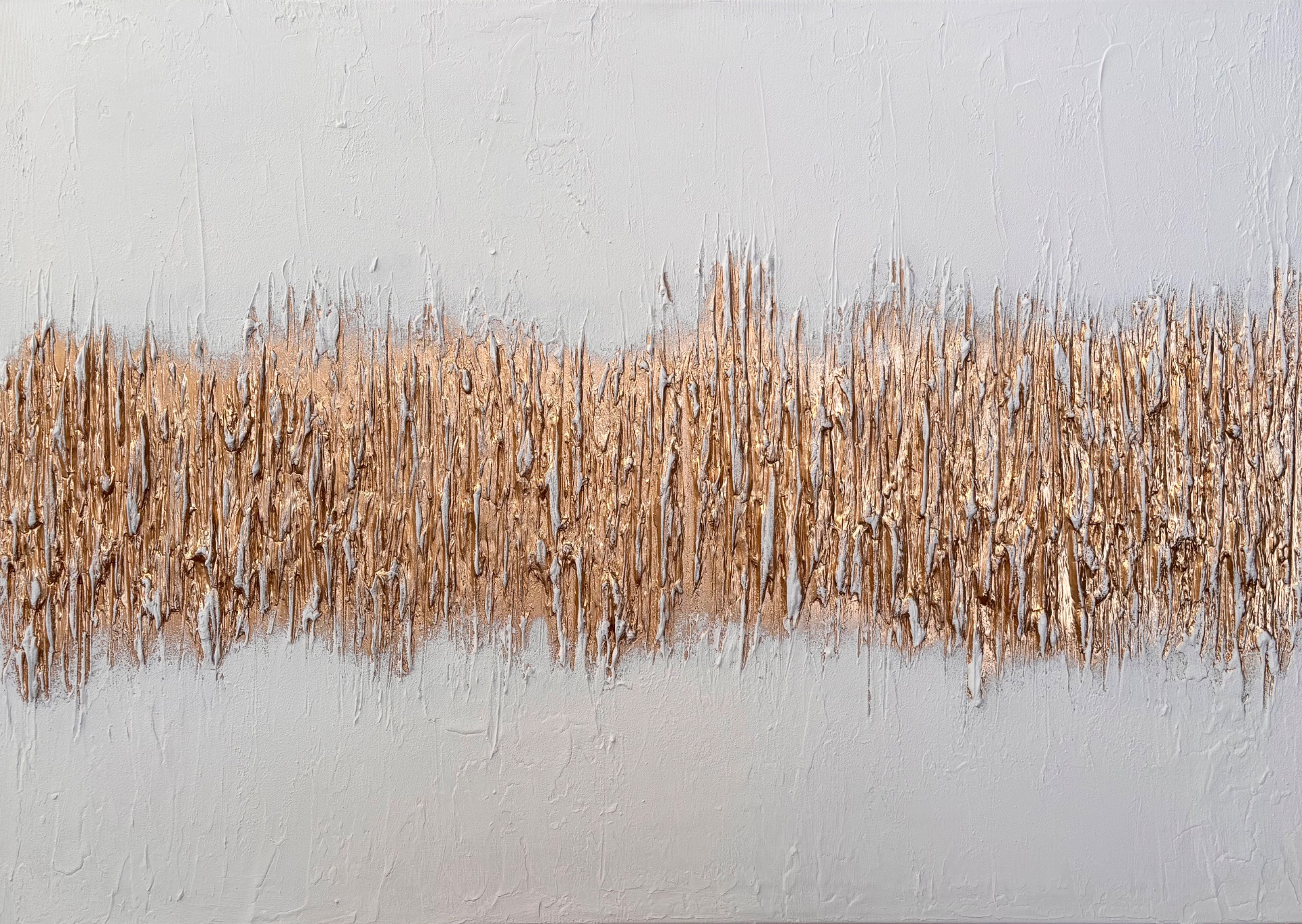 Strukturovaný zlatý pás, který prochází středem obrazu, připomíná vibrující linii – jemnou, ale silnou frekvenci, která se šíří prostorem. Zlatá barva zde symbolizuje hojnost, prosperitu a hodnotu, zatímco rytmus struktury vytváří pocit pohybu a živé energie.