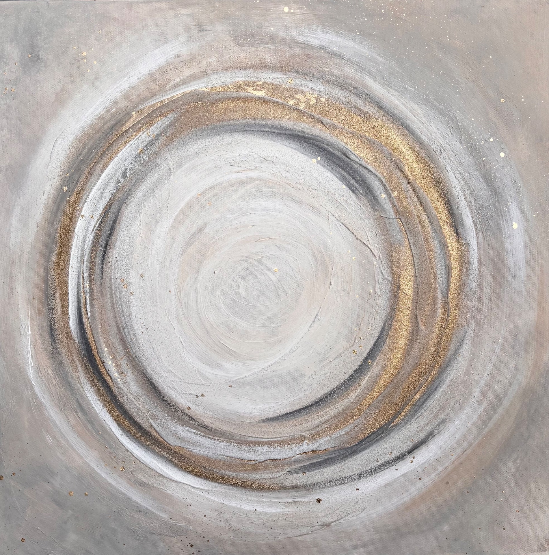 Druhý, šedo-zlatý kruh, nese v sobě hloubku, sílu a stabilitu. Šedá barva je introspektivní – vede nás dovnitř, k našemu středu. Je klidná, vyrovnaná, až meditační. Pomáhá zpomalit a vnímat rovnováhu mezi světem venku a tím uvnitř.