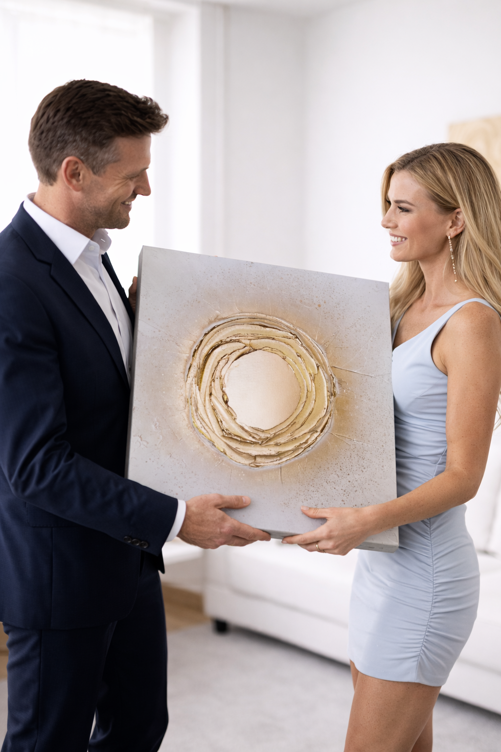 Obraz v jemných a zlatých tónech působí elegantně, nadčasově