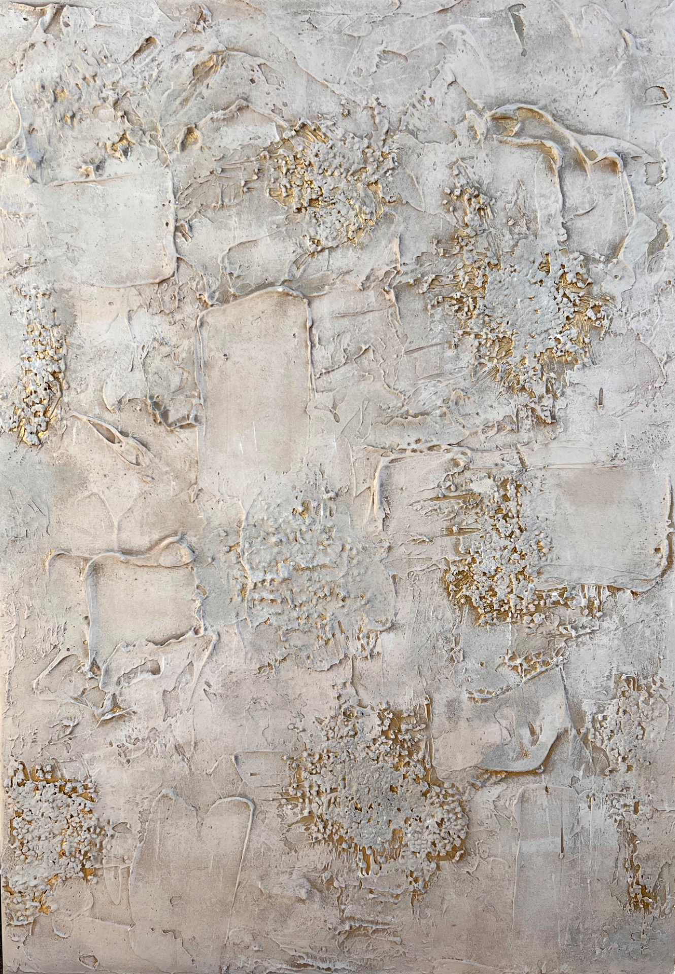 "Mapa k hojnosti" je obraz, který v sobě nese tajemství cesty k vnitřnímu naplnění. Jeho béžové tóny působí teple a klidně – jako starý pergamen, na kterém se zlatá barva jemně leskne a ukazuje směry, které nevidí oči, ale duše.