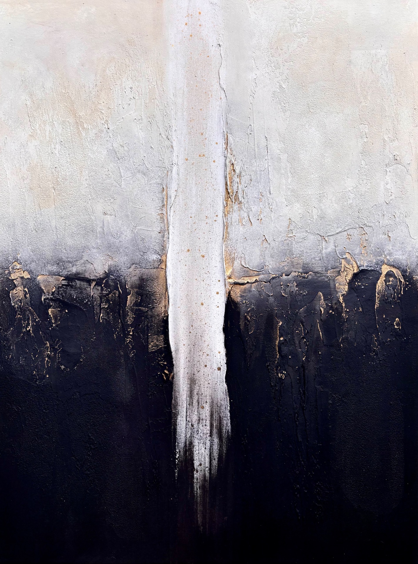 Tmavší spodní část obrazu představuje zhutněnou energii života, všechno, čím jsme prošli, co nás formovalo a co nosíme v sobě. Z tohoto základu však vystupuje světlo – jemně, ale neochvějně. Připomíná, že i uprostřed chaosu je vždy cesta vzhůru, cesta k vnitřnímu vedení.