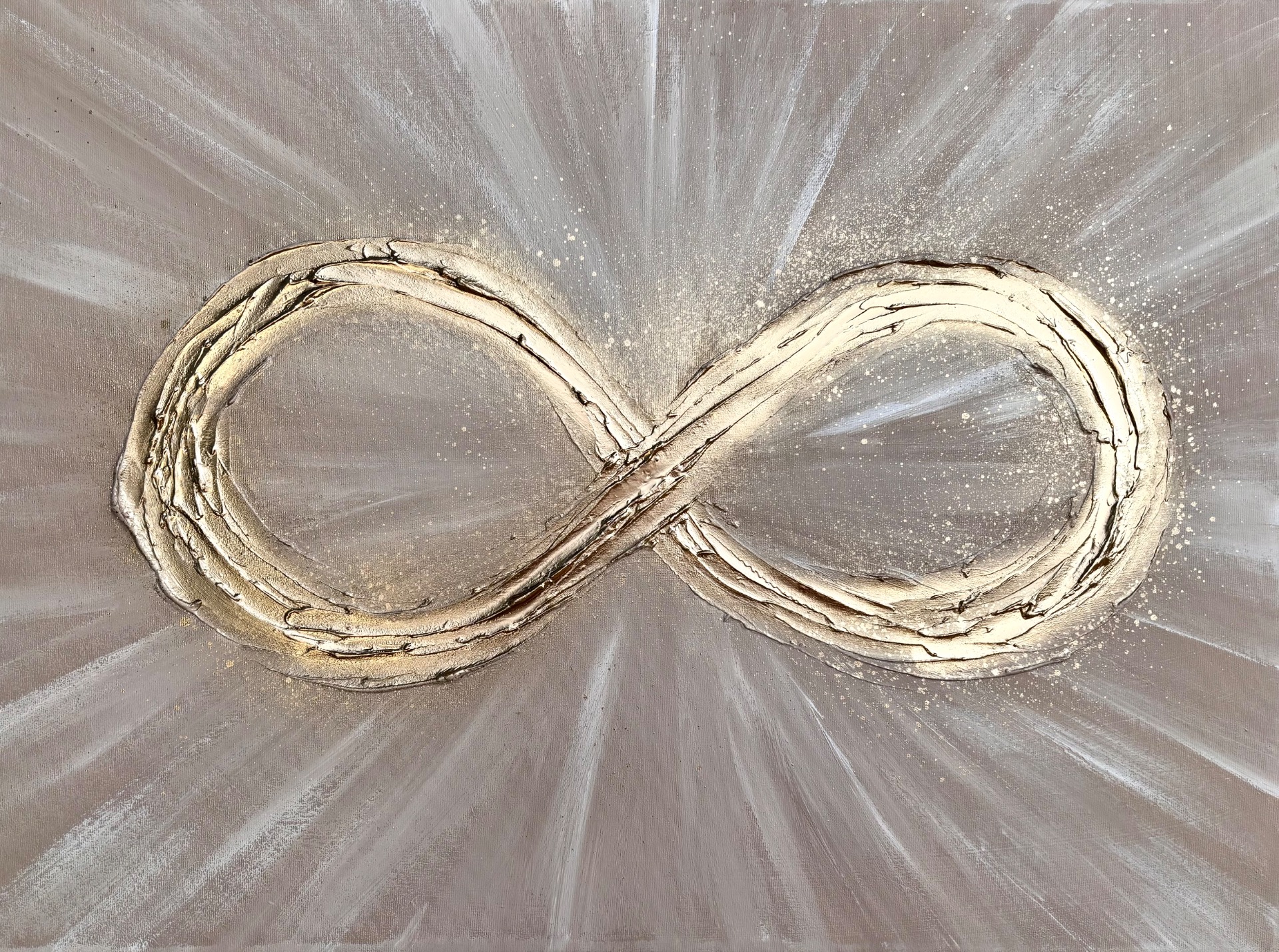 Obraz s názvem "Nekonečný zdroj hojnosti" připomíná, že skutečná hojnost nevzniká venku, ale uvnitř nás. Symbol nekonečna znázorňuje nepřetržitý tok energie, příležitostí i možností, které jsou nám stále k dispozici. Světelné paprsky vycházející ze středu naznačují, že ve chvíli, kdy se napojíme sami na sebe a svou hodnotu, začínáme tuto hojnost přirozeně přitahovat.