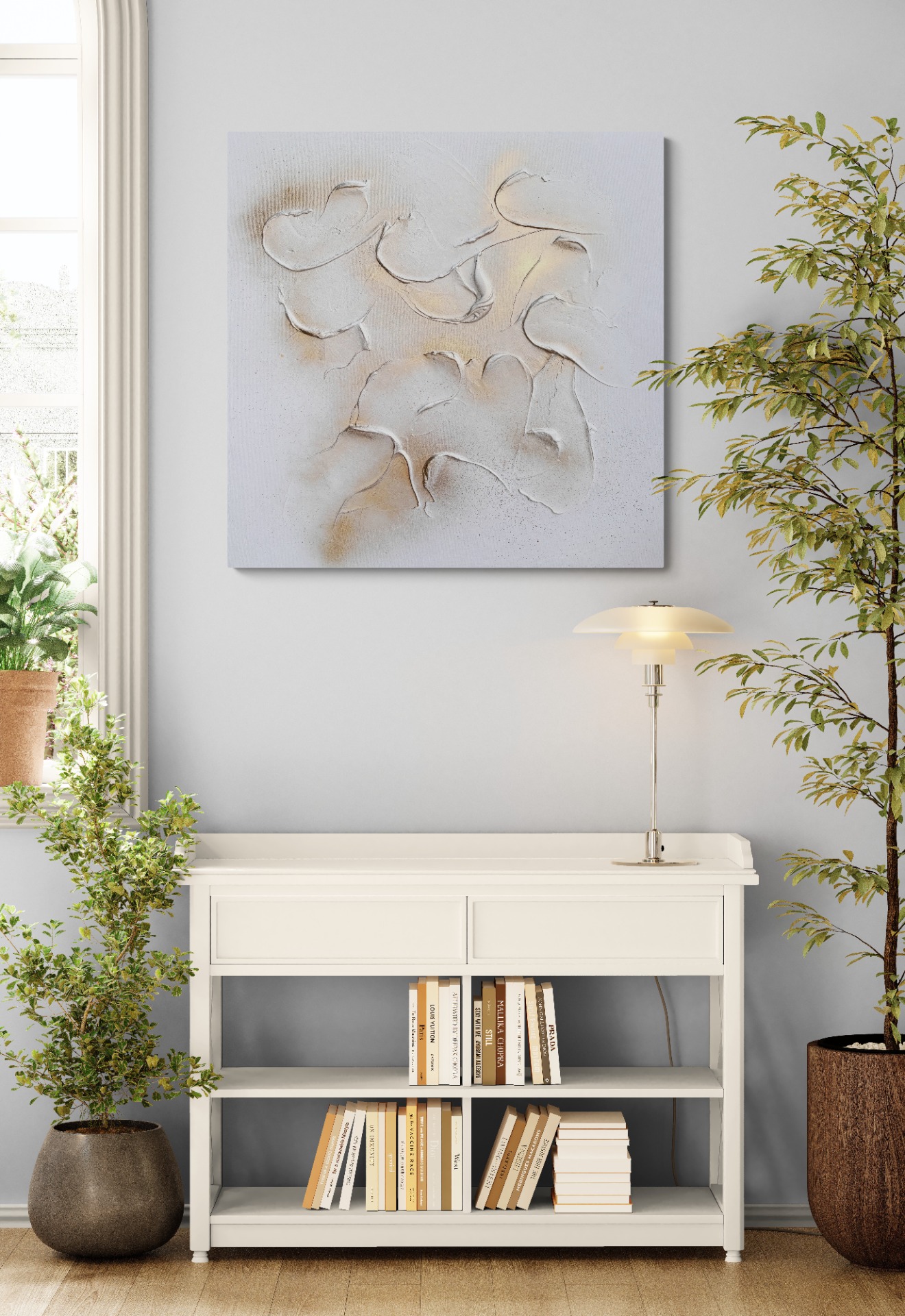 The golden accents in the paintings symbolize abundance that comes when we relax internally. They are a reminder that everything we desire can arrive naturally – without pressure, in peace. The white tones evoke a sense of luxury, purity, and minimalism, making the artworks perfect for modern and elegant interiors.