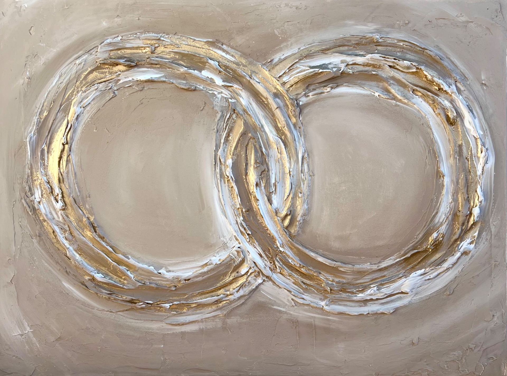 Kruhy se jemně protínají, jako by se objímaly – bez ztráty vlastní identity, ale s hlubokým porozuměním. Obraz připomíná, že skutečné propojení nevzniká z potřeby, ale z lásky a svobody.