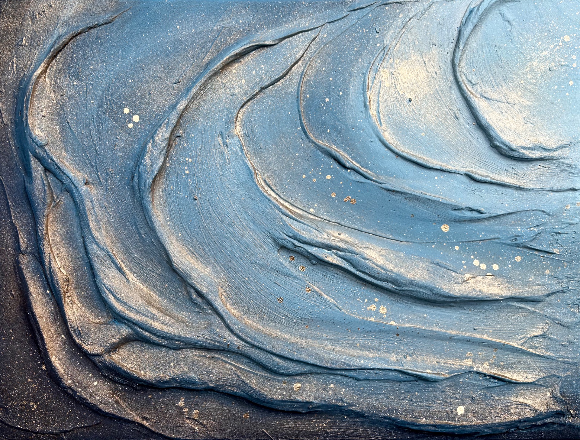 Vlny a modré tóny obrazu "V proudu hojnosti" připomínají proud vody, který k Tobě přináší energii hojnosti. V plynutí života nacházíš lehkost a přirozený tok prosperity.